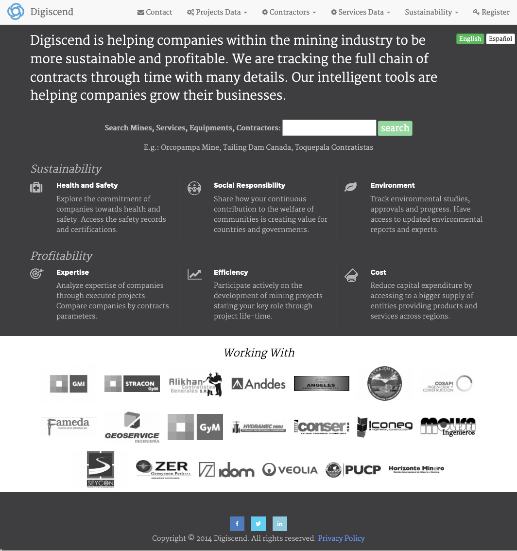 In Digiscend we were creating products for construction and engineering contractors working for Mining and Energy companies in Peru. We collect data of projects done by contractors and organize it making it usable and searchable. Thereafter creating our commercial products. I started this venture with a partner in Peru. I am the only programmer doing all development on this platform. Primary development is based on PHP/Mysql. Uses Wordpress for many tools used on the website. We also did OCR of massive government data sets using tesseract-ocr, Perl and bash script. We are using linear regression algorithm for machine learning cost estimation. Content work is handled from India and Peru. Data is also collected from customers in Peru and India.